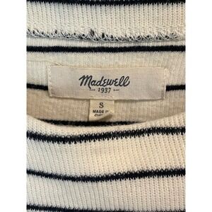 Keywords: Madewell, Striped Tank Top, Sleeveless Top, Mock Neck, Women's Top, Casual Top, Summer Top, Cream Top, Black Stripes, Relaxed Fit, Side Slits, Contemporary Style, Cotton Blend Top