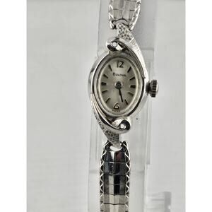 The 1968 Ladies Bulova 17 Jewel Cocktail Watch is a vintage luxury wristwatch designed for women with a unique oval shape case, this classic timepiece features a silver dial with Arabic numerals, stick indexes, making it a stylish and elegant accessory for any formal or dressy occasion. With 17 jewels, a Swiss movement, and a 12-hour dial, this limited edition watch exudes sophistication and charm, making it a timeless piece for any leading lady's collection.