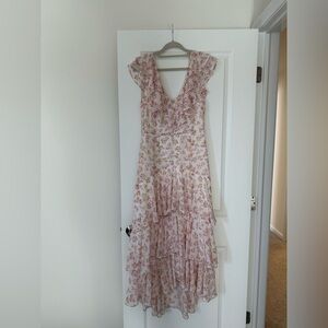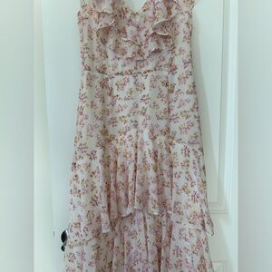 Chic dress with pink floral design. Features a V-neck and ruffle details. Perfect for stylish outings.