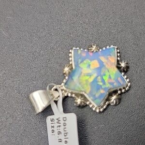 Beautiful star-shaped opal doublet pendant set in .925 sterling silver. The opal displays vibrant flashes of blue, green, yellow, and orange with excellent color play under light. The decorative silver setting features detailed bead and star accents that frame the stone nicely.