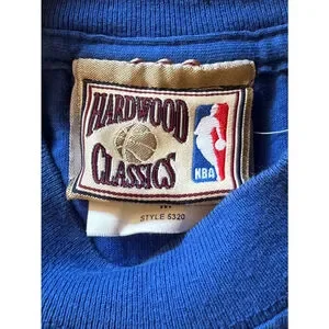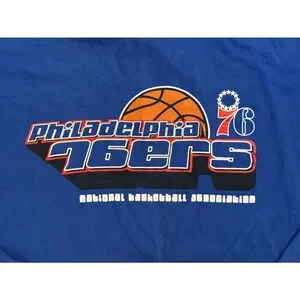This is a pre-owned vintage long-sleeve t-shirt by Majestic. It is a size M and is made of 100% cotton. The shirt is blue with a white and red Philadelphia 76ers logo on the front and a white and red "National Basketball Association" logo on the left sleeve. The shirt has a crew neck. The shirt is in good condition with no visible tears or stains. Some of the lettering is slightly cracking mostly on sleeve. The tag reads "Hardwood Classics" and "Style 5320". Please see pictures for measurements and condition