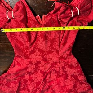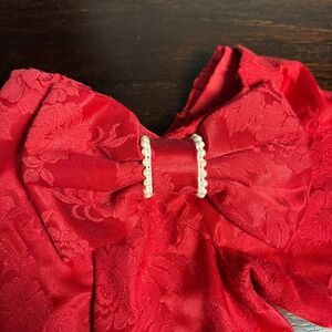 Keywords: Gunne Sax dress, red dress, brocade dress, off the shoulder, bow detail, pearl embellishment, vintage dress, formal dress, cocktail dress, special occasion, romantic, feminine, evening wear, party dress