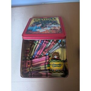 Keywords: Crayola tin, 1992 Crayola, Christmas tin, Holiday tin, Vintage Crayola, Collectible tin, Kids drawing, Christmas tree, Dog and children, Retro decor, Art supply tin, Childhood memories, Nostalgic, Holiday gift, Crayola box