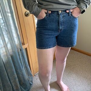 Somewhat of a “mom” jean. Hi-rise vintage Eddie Bauer jean short size 8. Inseam is 4 inches; rise is about 11-1/2 inches; waist is about 15 inches. 100% cotton.