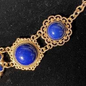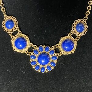 Keywords: gold tone necklace, blue cabochon necklace, statement necklace, floral necklace, flower pendant, choker necklace, costume jewelry, fashion necklace, vintage style necklace