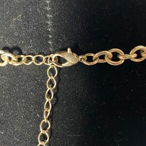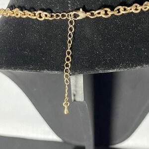 A striking gold-tone necklace adorned with vibrant blue cabochon stones arranged in a beautiful floral design. This statement piece features a central flower motif with surrounding petal-like elements and additional circular accents along the chain, creating a captivating and elegant look. The adjustable link chain ensures a customizable fit.