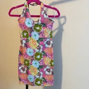Vibrant floral pattern. Halter neck design. Perfect for casual outings.