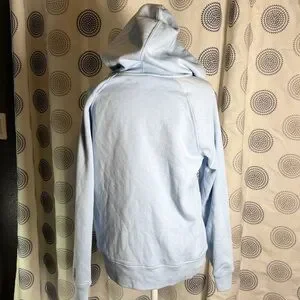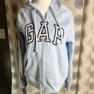 Sky blue hoodie with bold GAP lettering. Includes front pockets and adjustable hood.