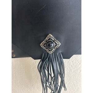 Decorative metal studs, central metallic embellishment with a black stone, long leather fringe