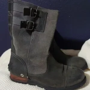 Sorel Major Pull On Boots for women in grey. Featuring a combination of suede and leather, a mid-calf shaft height, and dual buckle closures for a rugged yet stylish look.