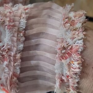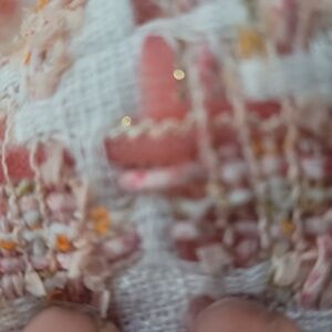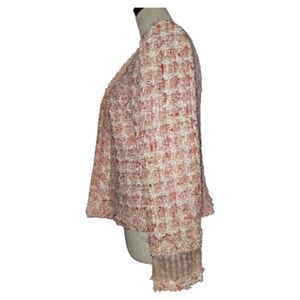 This elegant pink white tweed boucle jacket by designer Oscar de la renta offers a sophisticated touch to any outfit. Luxury designer from spring 2011 collection. It has shoulder pads and a zip front. The size tag is ripped so I'm not positive what it says. It appears to be a designer size 1, but Measures approx 19" pit to pit across back which puts it at a small and is lined in pink silk. My dress form is a size 4/6. There is also some metallic thread but it's very hard to see check out last picture. The first image is Ai generated to give you an idea of fit and Pic doesn't include sleeve detail at wrist see pics 5 & 6. Browse my closet and bundle to save 20%. Offers always welcome. Non smoking cat friendly home. Bookmark; my closet as new items added weekly. Thank you for shopping my closet.