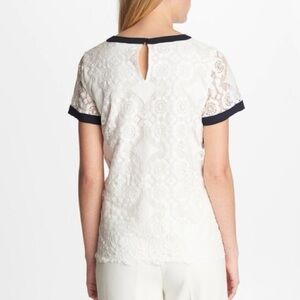 NWT. This elegant lace top features a chic navy and white striped design. Perfect for any occasion, it combines style and comfort effortlessly. Keyhole and covered button. Fully lined. Smoke/pet free.