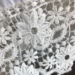White and cream colour long sleeve lace top, with floral inspired design. Loved this item, but ready for something new. When I wore it, the sleeves would come up to my mid-palm. The hem of the shirt would also cover my hips.