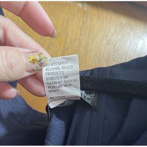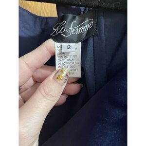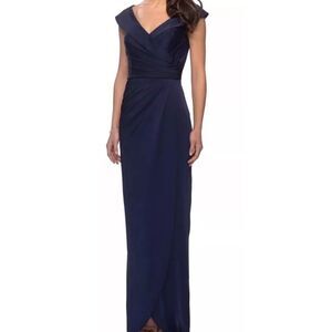 This is a La Femme navy blue column gown in size 12 for women. It features an off the shoulder neckline, suitable for occasions like weddings, parties, or formal events. The style is a ball gown with a long dress length, perfect for making a statement at special occasions.