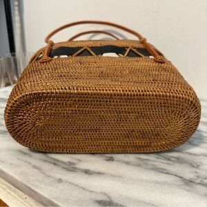 This stylish woven bag features a chic black bow, perfect for any occasion. Its elegant tan color adds a touch of sophistication to your outfit.