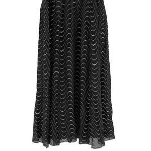 Wavy dot pattern, ruffled neck and armholes, and embellished collar with keyhole front. Center back zipper with hook-and-eye closure. Midi length.