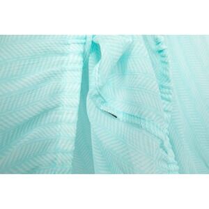Lightweight and airy sheer blouse in a soft aqua blue shade by The Limited. Features a subtle chevron pattern, 3-button henley neckline, and long sleeves with gathered cuffs. Relaxed fit make this top ideal for layering over camis or bralettes. Great for work or casual wear. Care tag has been removed, but fabric appears to be polyester or a similar lightweight blend.