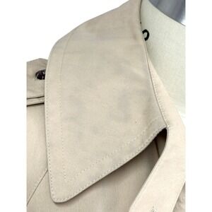 Vintage Etienne Aigner Double Breasted Fully Lined Belted Trench Coat with Belted Cuffs, Epaulets, 2 Front Slash Pockets, Slit in the Back, Made in Hong Kong. Overall great condition, there is some faint discoloration on the collar as shown- very minimal, but please look at the photos. It wasn't worn much, the lining is impeccable, The only other flaw is leather on the belt buckle is slightly worn. Great vintage coat!