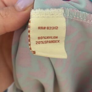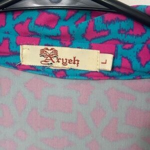 Stylish wrap dress by Aryeh. Features a vibrant blue and pink pattern. Perfect for any occasion.