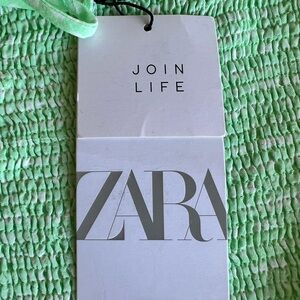This stylish green crop blouse from Zara features a smocked design that offers a textured, gathered look. The cap sleeves and ruffled details add a touch of elegance, making it a perfect choice for a fresh, spring-like appearance.