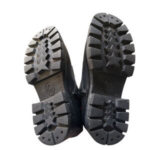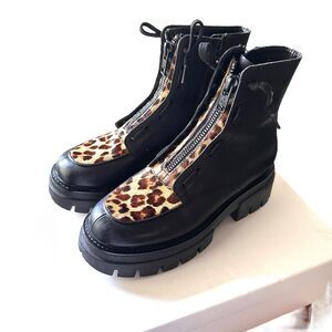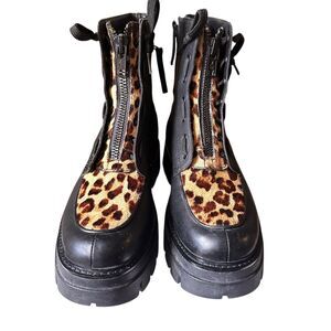 Black leather combat boots, leopard print calf hair detail