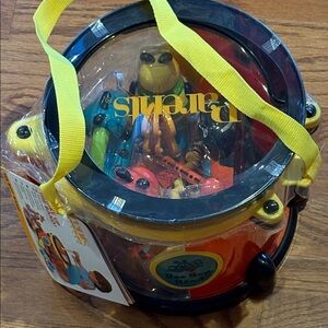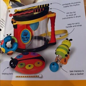 Parents Magazine play and learn Bee Bop Band. Strike up the band! Set includes ant jingles, bee clacker / maraca, caterpillar tambourine, centipede drumsticks, ladybug bells and a drum with neck strap that store all the instruments inside of it. NWT and sealed drum full of instruments. 18+months.