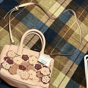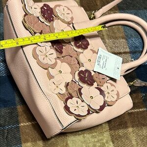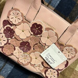 Elegant satchel with pink and burgundy floral design. Features dual handles and gold-tone accents. Perfect for any occasion.