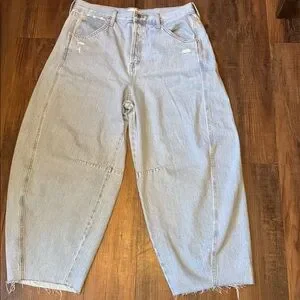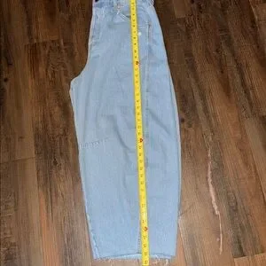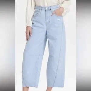 Chic light blue jeans with a wide leg design. Perfect for a relaxed and stylish look.high rise curved leg jeans