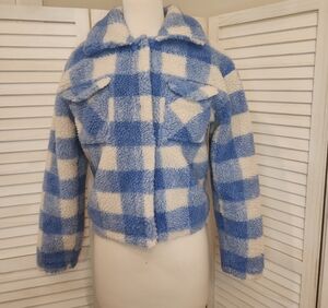 Soft fleece jacket with a blue and white plaid design. Features a stylish collar and convenient front pockets.