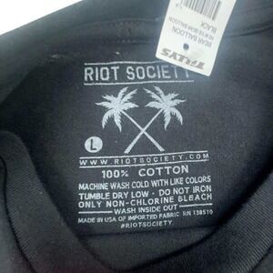 Unleash your inner rebel with this edgy Riot Society T-shirt, a darkly playful statement piece that's sure to turn heads. Showcasing a whimsical yet subversive graphic of a headless bear clutching a sinister teddy bear balloon, this tee oozes urban cool with a touch of macabre humor. The rainbow-lettered "Riot Society" logo adds a pop of color against the black canvas, injecting an element of street art into your wardrobe. Whether you're hitting up a concert, exploring a new city, or just chilling with friends, this T-shirt is the perfect way to showcase your unique sense of style and rebellious spirit.