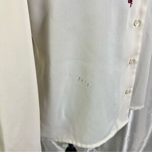Add a touch of romantic cottagecore and academia charm to your wardrobe with this vintage embroidered cream button-down shirt. Featuring delicate embroidery and a classic silhouette, this versatile piece can be styled tucked into high-waisted trousers, layered under sweaters, or worn loose for a more relaxed boho look.