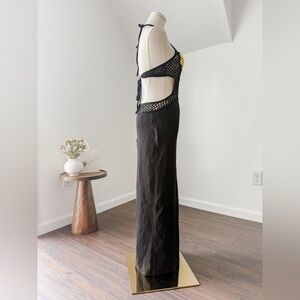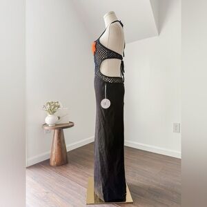 STUAD's Jacqueline column dress features a sleek halterneck and backless design. Crafted with mesh at the bodice, this style flaunts bright flower details.