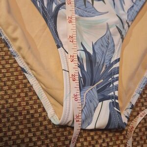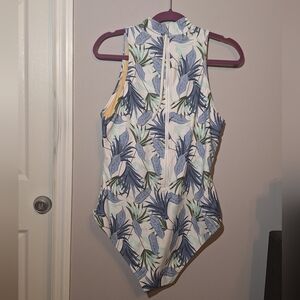 Dive into style with this tropical print one piece swimsuit. Featuring a blend of blue, green, and cream colors, this swimsuit is perfect for a chic beach look. Full coverage no worries swimsuit.