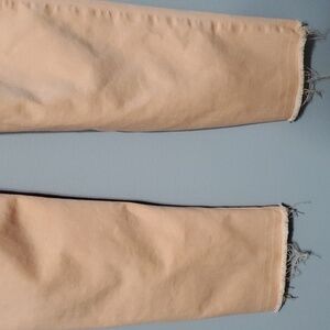 Stylish peach flirty girlfriend slim leg ankle jeans with frayed hem. Perfect for casual outings. spring color summer fun awaits!