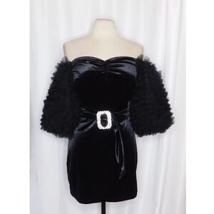 NWT!! ZARA Black Velvet Dress Ruffled Tulle Sleeves Rhinestone Party Cocktail