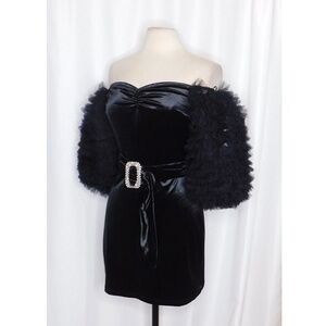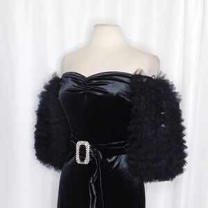 Sweetheart neckline with ruching/gathering in the center of the bust ~ Short sleeves that can be worn off or on the shoulders ~ Sleeves are an exaggerated puff style made from layered ruffles of tulle fabric … with an elastic/stretchy end or cuff ~ Empire bodice ~ Adjustable/Removable sash belt at waist with a large, embellished rhinestone buckle ~ Skirt has a slight A-line flare ~ Mini length ~ Concealed zipper down the back ~ Soft unlined velvet fabric …. Fabric does have some stretch ~ Solid black … so classy!