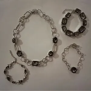This elegant costume jewelry set features stunning black stones, perfect for adding a touch of sophistication to any outfit. The set includes a necklace and three bracelets, all designed to complement each other beautifully.