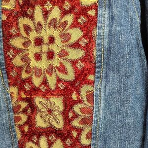 cotton denim jacket with tapestry embellished areas. pit to pit 26" length 25"