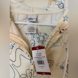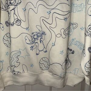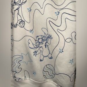 Disney Stitch pullover hoodie featuring a cream base with blue line-art all-over Stitch and space-themed print. Soft fleece interior with attached hood, ribbed cuffs and hem. New with original tags.