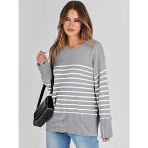 Women's Gray White Stripe Oversized Long Sleeve Casual Fuzzy Knit Sweaters