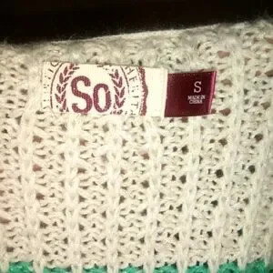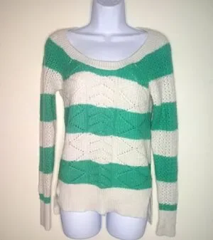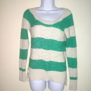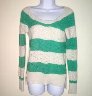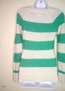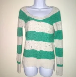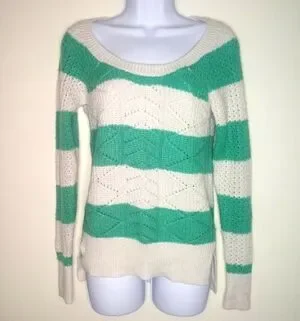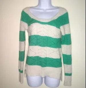SO green and white striped knit sweater with a Deep scoop neck ribbed cuffs and hem slightly longer in back with side vents for layering