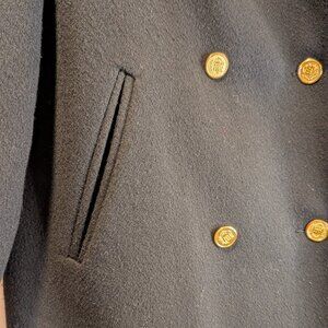 Featuring a fully lined interior, interior button to keep the cold out, and a top exterior button to truly battle the weather, this jacket will keep you warm and stylish for decades. Black, 100% wool with gorgeous gold hardware.