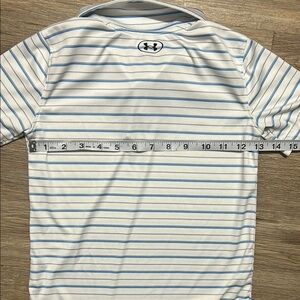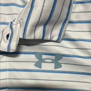 This Under Armour kids polo shirt features a stylish white and blue striped design. Perfect for casual outings or school days, it offers comfort and style in one.