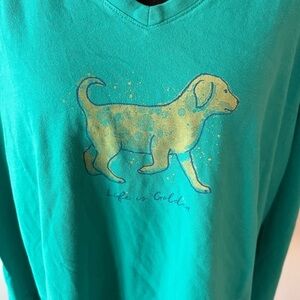 Life Is Good Turquoise V-Neck Tee with Golden Retriever Size XXL
