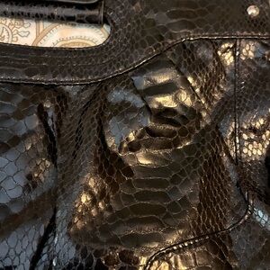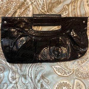 This elegant black clutch is perfect for any occasion. Its sleek design and versatile color make it a must-have accessory. Subtle snake skin pattern. Only used a couple of times.