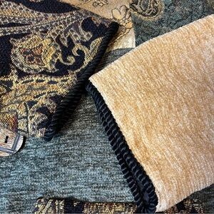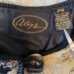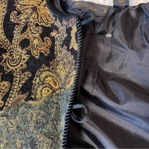 beautiful vintage Alex Kim art-to-wear jacket Size Small Petite, featuring a striking patchwork tapestry design in gold, black, and olive tones. Mixed brocade and jacquard fabrics with floral and paisley patterns create a unique, elegant look.