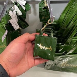 Chic glossy tote keychain with Harrods branding. Ideal for adding flair to your keys.