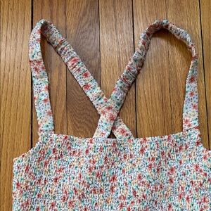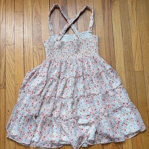 Chic smocked sun dress with a floral pattern. Features a blend of pastel colors. Great for festivals!