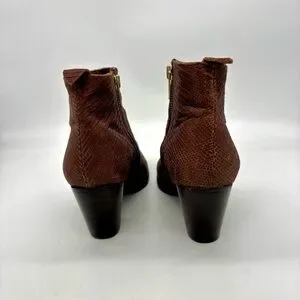 Brown leather with reptile pattern. Side zip with 2.5 inch heel. In excellent condition with only minor signs of wear.