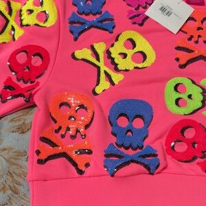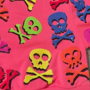 Vibrant sweatshirt with sequin skull designs. Features pink, yellow, blue, and orange skull and crossbones sweatshirt. Halloween!!